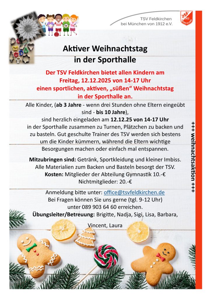 “Sport, Spiel und Spaß für Kinder” am Mittwoch ist derzeit ziemlich voll, bitte weichen Sie auf die Stunde am Dienstag “Kleinkinderturnen” aus.